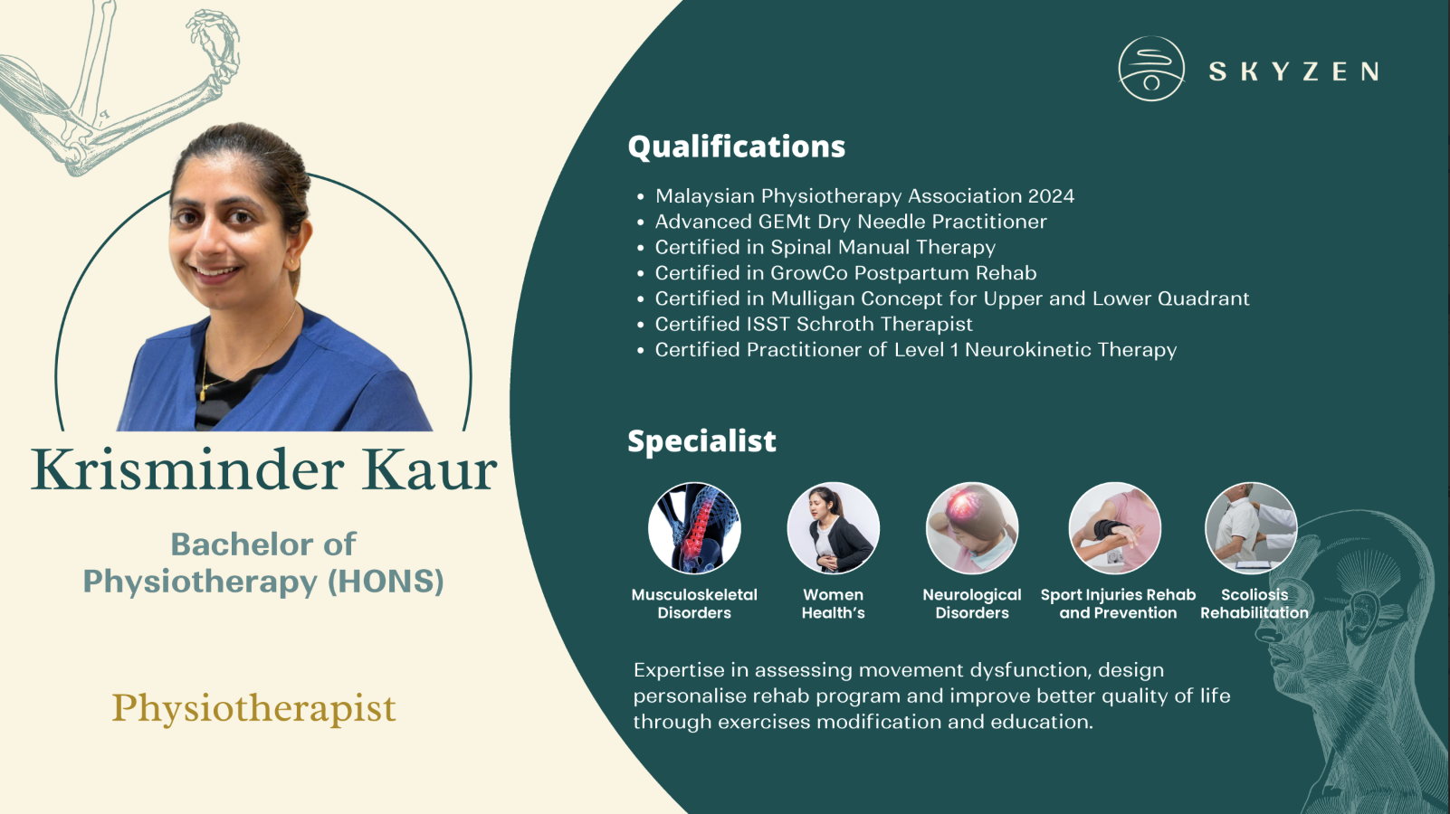 Specialist in Movement Dysfunction Assesments, Personalised Rehab Program, Exercises Modification and Education.